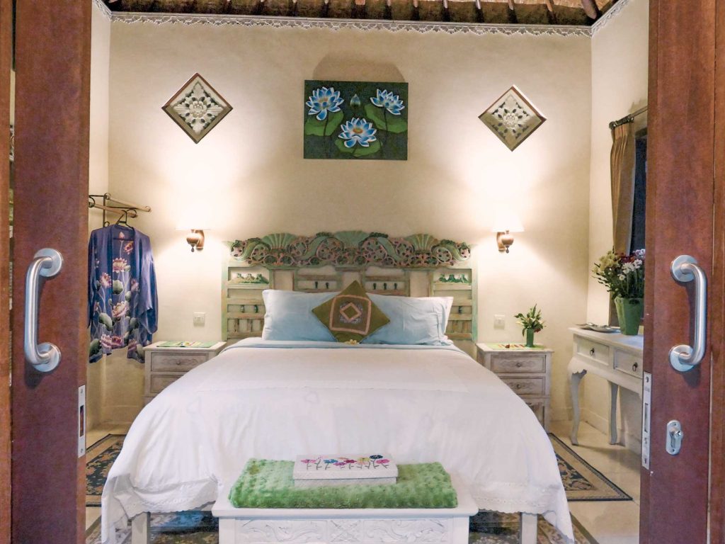Hidden within the lush tropical gardens of Devi’s Place, Lotus Cottage offers a peaceful and private retreat for a solo traveler seeking peace and quiet away from the hustle and bustle of Ubud. This self-contained cottage is thoughtfully designed and decorated in soft pastel colors, providing a calming atmosphere that complements its natural surroundings.
