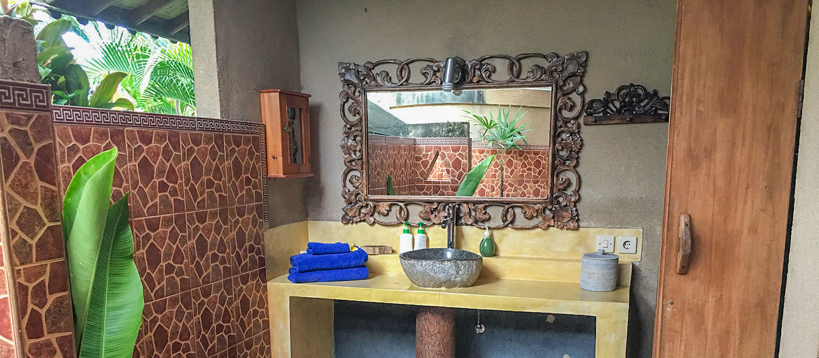 Inside, the bedroom is equipped with air conditioning, a ceiling fan, and a smart TV for added comfort. The ensuite outdoor bathroom is spacious and private, offering a delightful rain shower experience under the stars. The practical stone wash-basin and polished cement vanity provide a blend of rustic charm and modern functionality.
