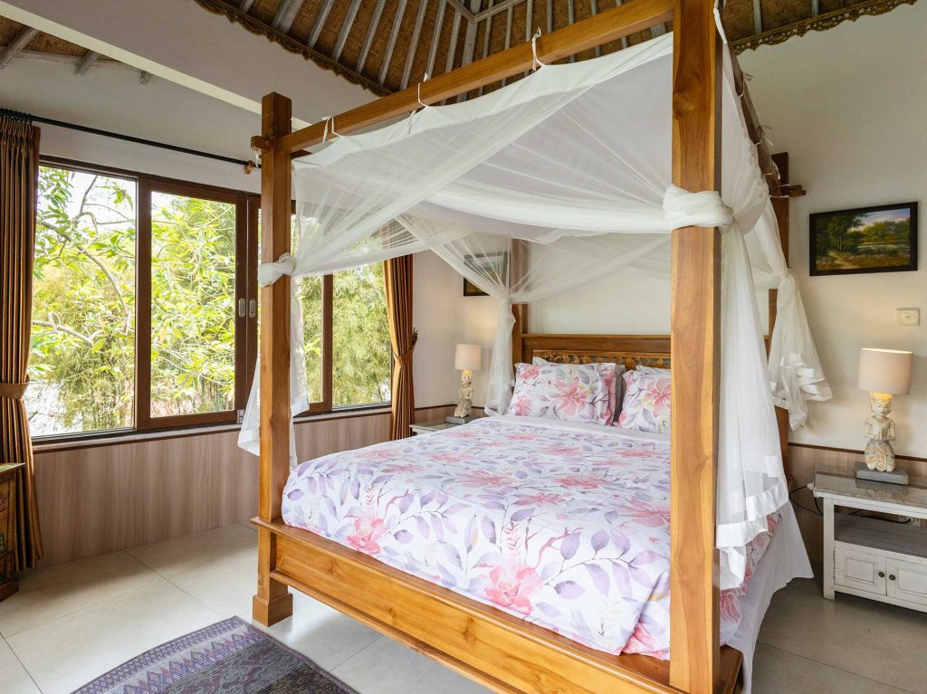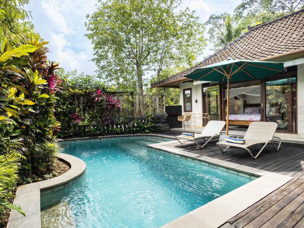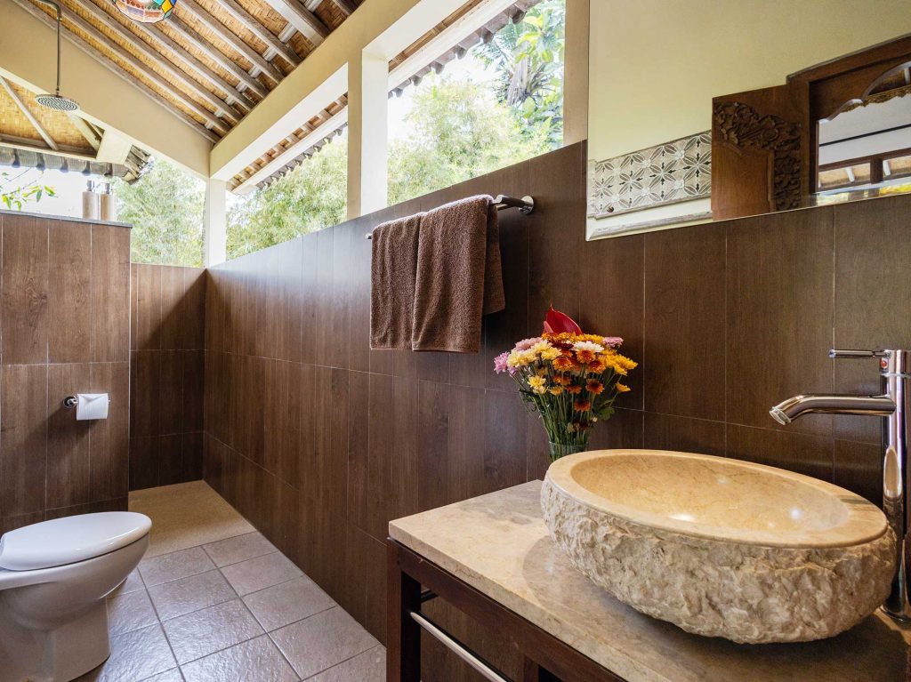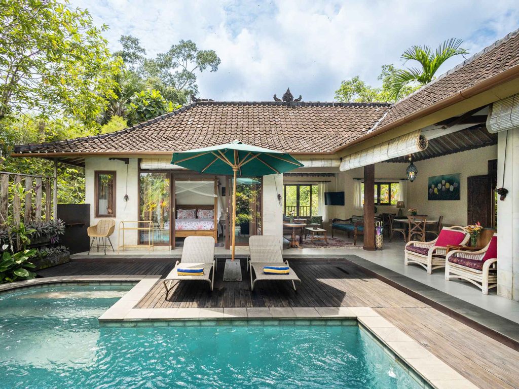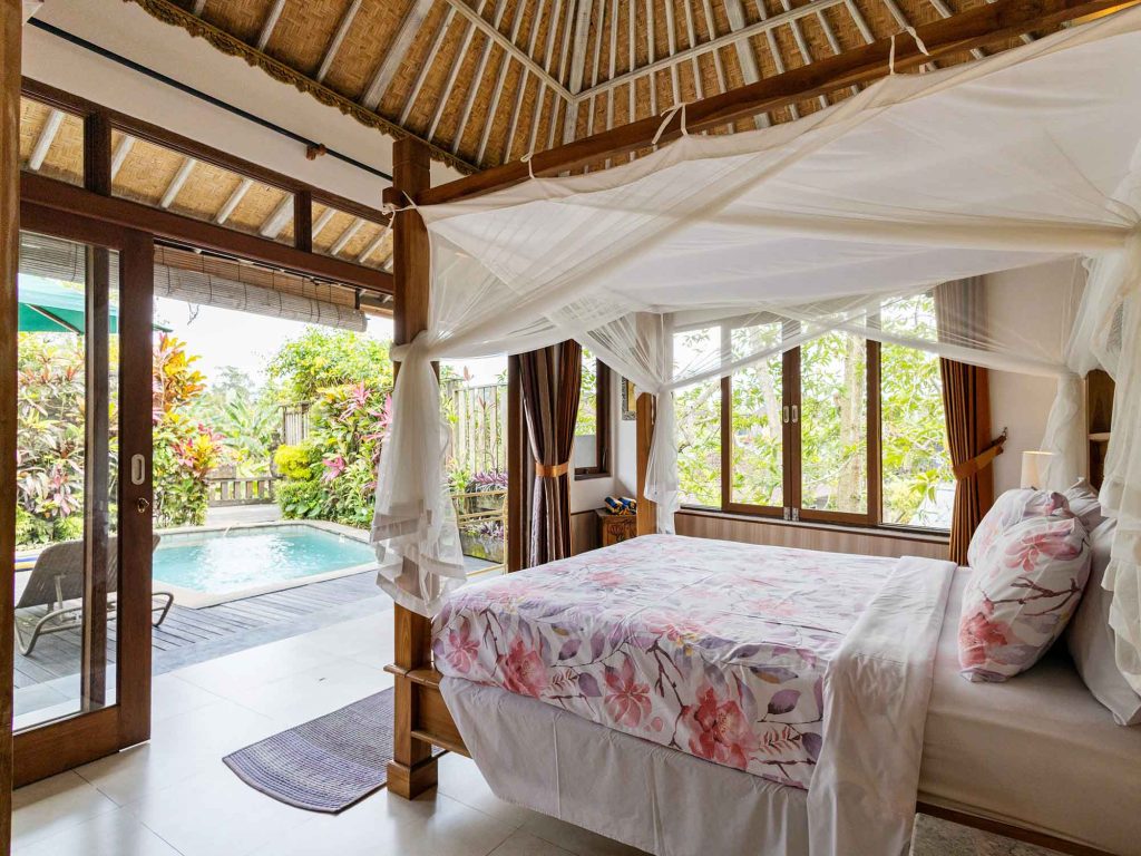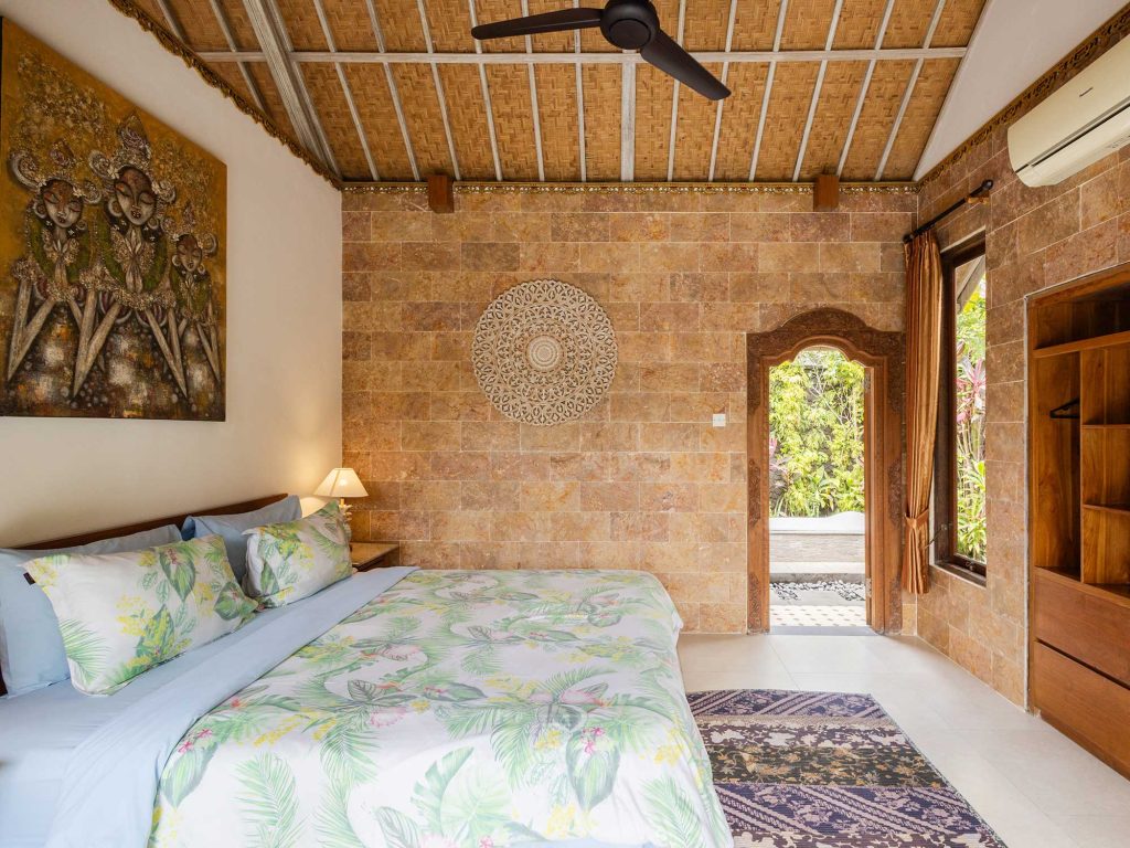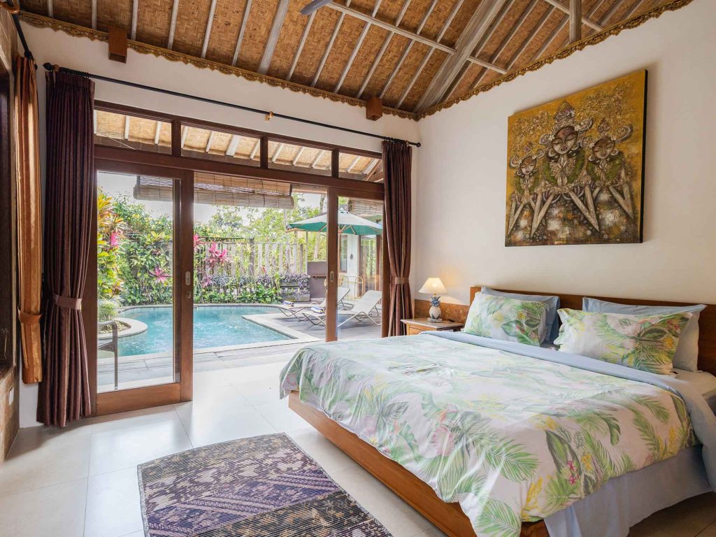 The villa has 2 spacious bedrooms, each with its own ensuite bathroom. Both bedrooms feature sliding glass doors that open onto the pool area. One bedroom has a king-sized bed, while the other has a queen-sized canopy bed. Both bedrooms are equipped with air conditioning and blackout curtains for comfort. The kitchen is equipped with essential appliances, including an electric jug, toaster, blender, fridge, gas hobs, and a small benchtop oven. The kitchen is well-stocked with crockery, cutlery, and cooking utensils, and its green Javanese granite countertops add a beautiful touch.