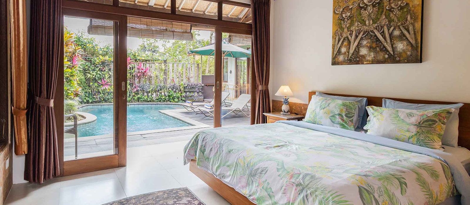 The villa has 2 spacious bedrooms, each with its own ensuite bathroom. Both bedrooms feature sliding glass doors that open onto the pool area. One bedroom has a king-sized bed, while the other has a queen-sized canopy bed. Both bedrooms are equipped with air conditioning and blackout curtains for comfort. The kitchen is equipped with essential appliances, including an electric jug, toaster, blender, fridge, gas hobs, and a small benchtop oven. The kitchen is well-stocked with crockery, cutlery, and cooking utensils, and its green Javanese granite countertops add a beautiful touch.