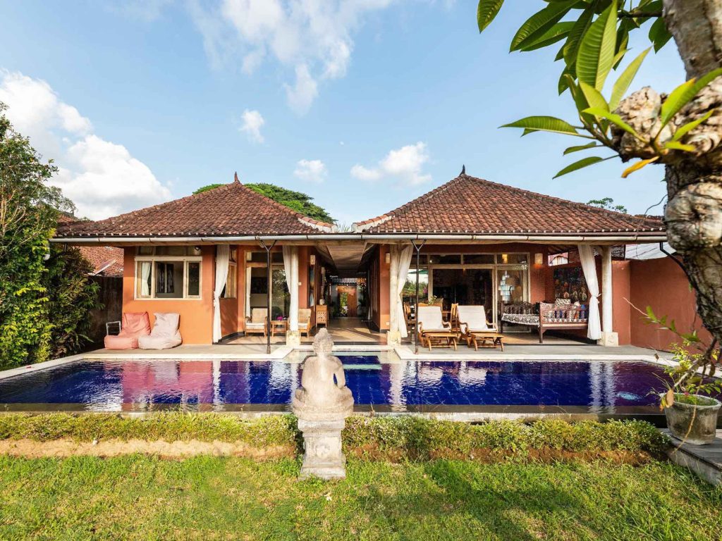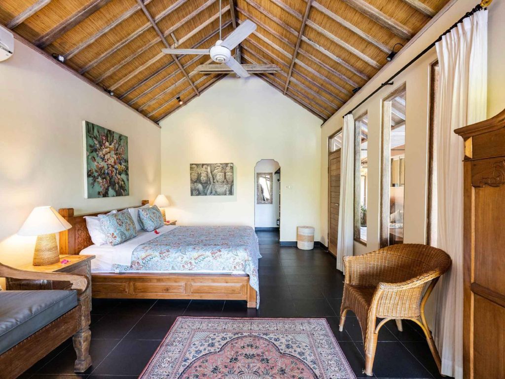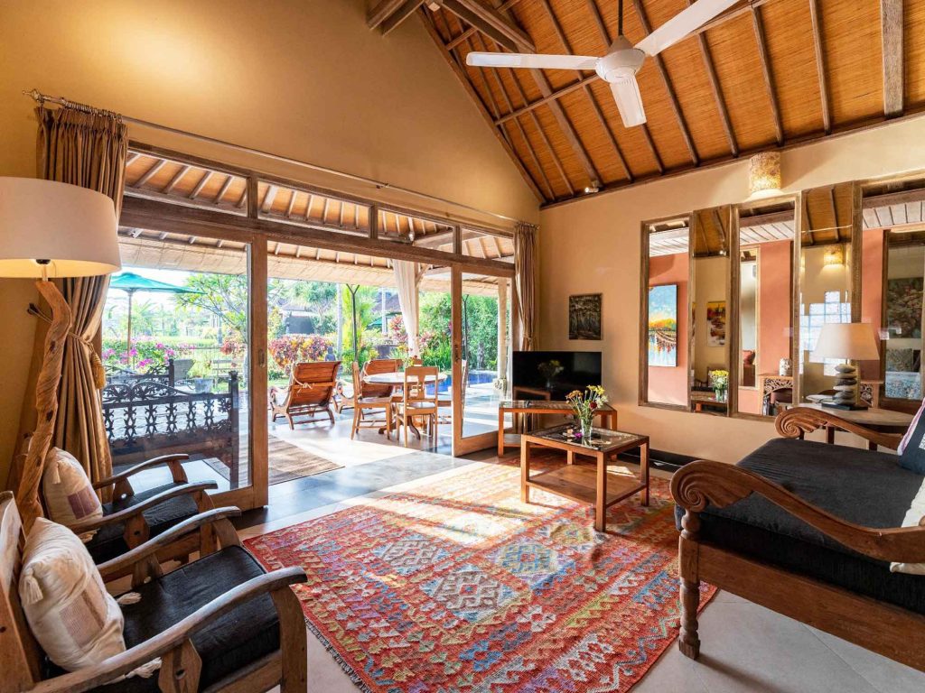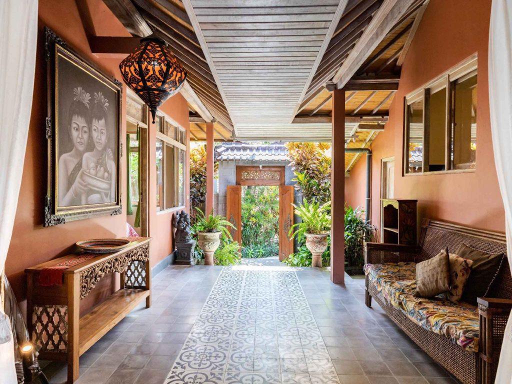 Designed in traditional Balinese style, Villa Bella consists of 2 pavilions connected by a covered breeze-way. One pavilion houses the 2 spacious bedrooms, each with its own ensuite bathroom. The main bedroom, located at the front of the house, features a dressing room, office area, and a large couch for added comfort. The other pavilion is home to the open-plan lounge, living, and kitchen areas. This bright, airy space is furnished with quality antique furniture and complemented by gorgeous artwork, creating a warm and inviting atmosphere.