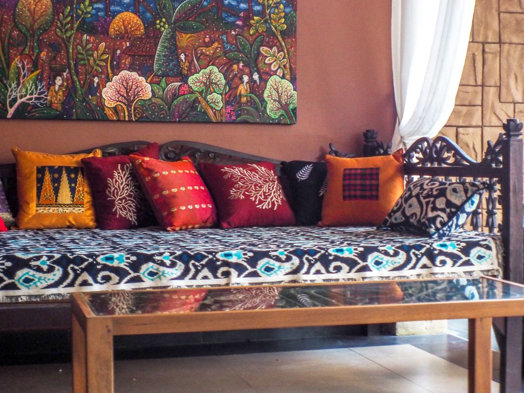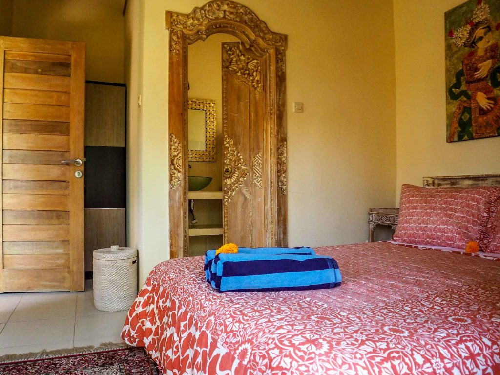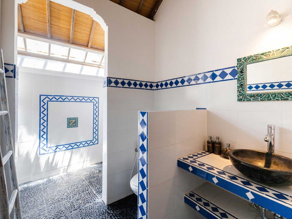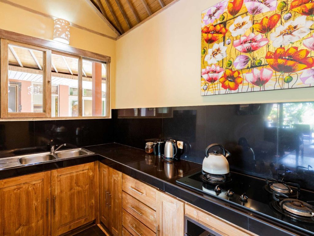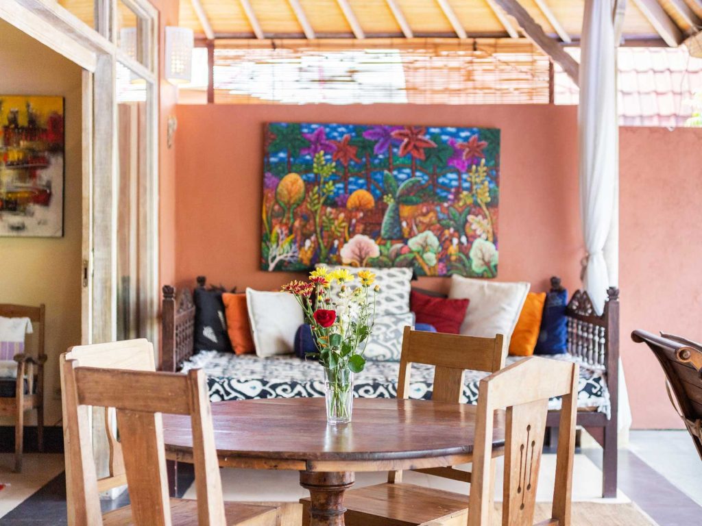 Designed in traditional Balinese style, Villa Bella consists of 2 pavilions connected by a covered breeze-way. One pavilion houses the 2 spacious bedrooms, each with its own ensuite bathroom. The main bedroom, located at the front of the house, features a dressing room, office area, and a large couch for added comfort. The other pavilion is home to the open-plan lounge, living, and kitchen areas. This bright, airy space is furnished with quality antique furniture and complemented by gorgeous artwork, creating a warm and inviting atmosphere.