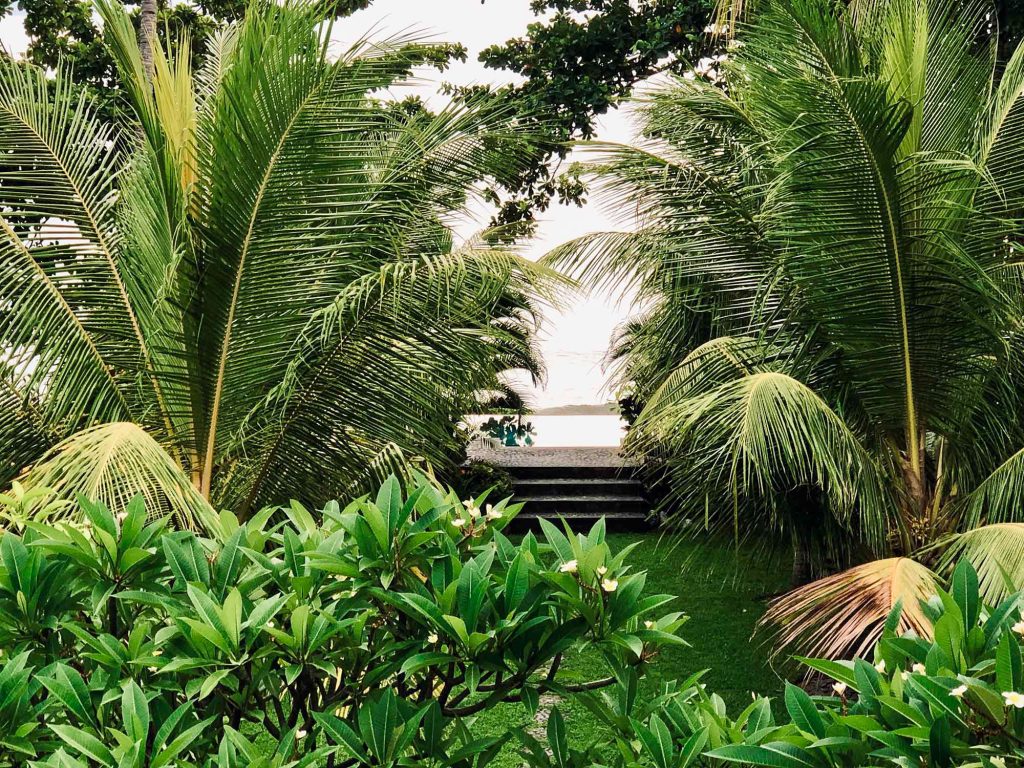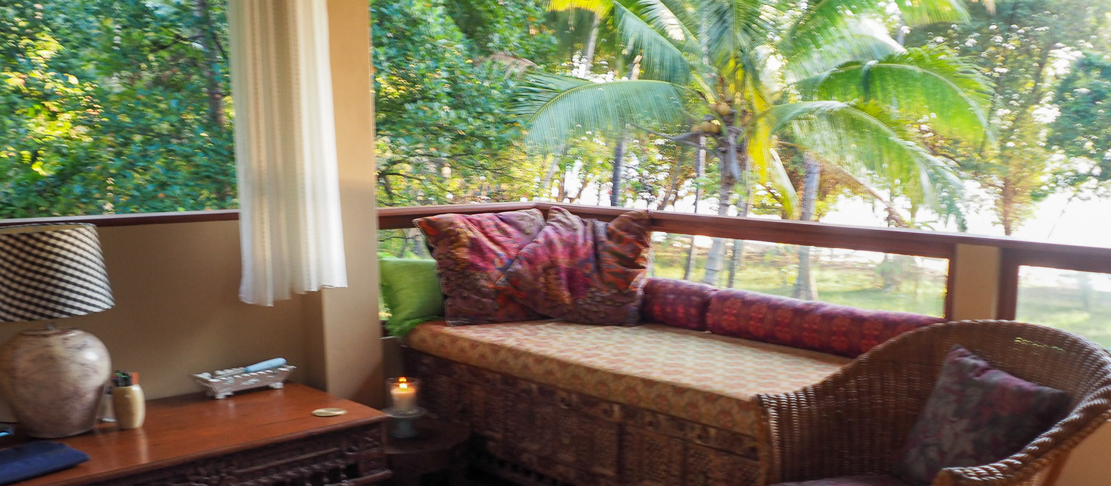 The property spans two stories, each complete with all necessary amenities. In total, there are 3 bedrooms, 2 bathrooms, 2 kitchens, a comfortable indoor lounge, and 2 open terraces with a large daybed and outdoor dining area. The layout flows seamlessly from the terrace, through the garden, to the elevated pool area with a sunrise pavilion, and down the steps to the beach. All the beds, including the daybed on the terrace, are queen-sized. The bedrooms and living room are air-conditioned, while the daybed on the terrace is protected by a mosquito net and cooled by the ocean breezes.